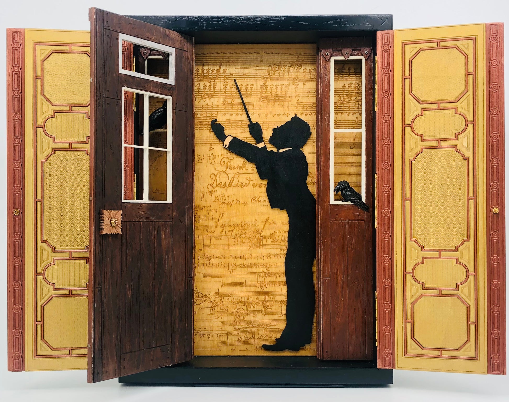 The inner doors are my interpretation of Mahler’s 3rd composing cottage. The engravings on the walls are excerpts from his manuscripts. Gustav Mahler reveled in the quiet and calm of Tyrol, accompanied only by the cawing of crows.
