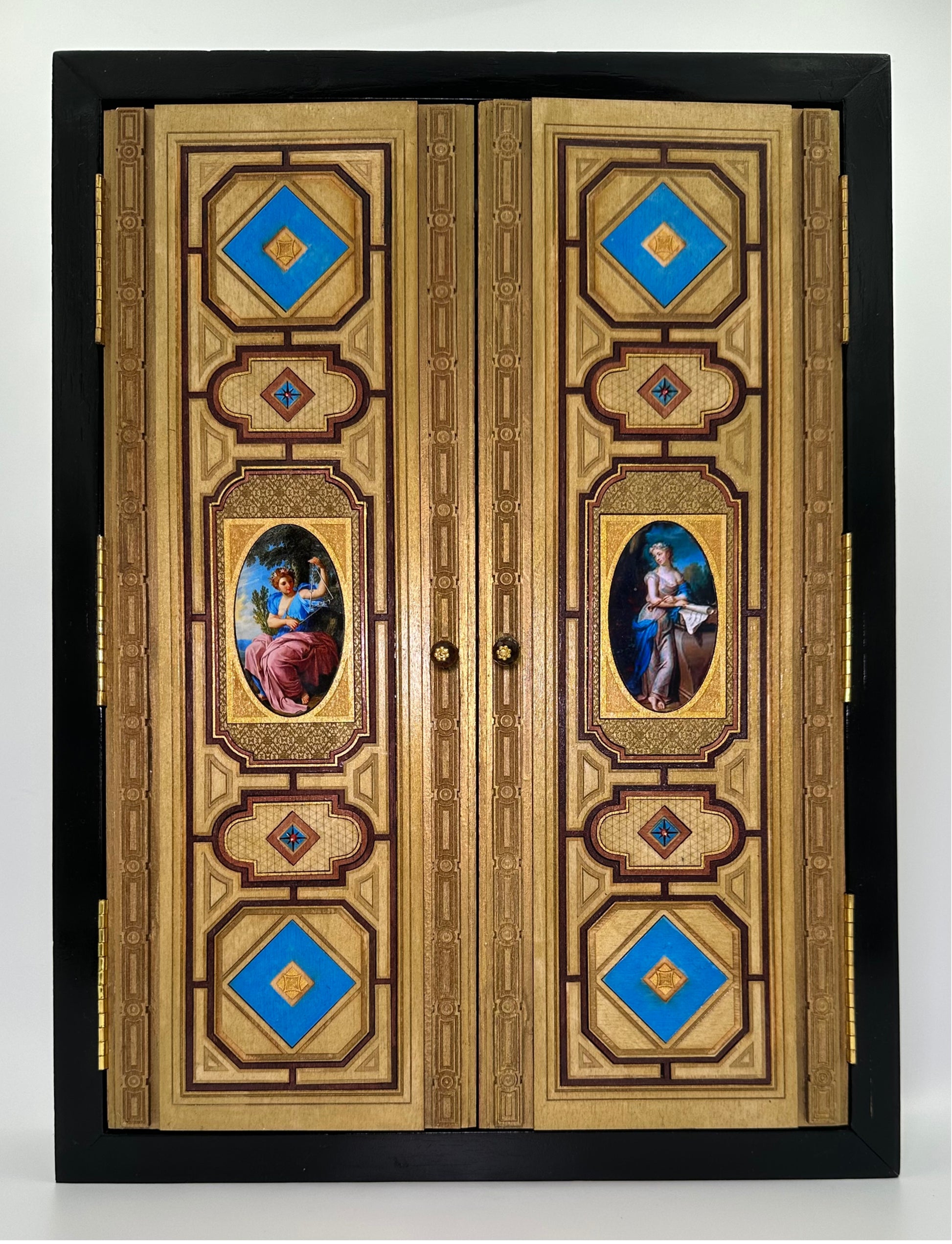 These doors are my interpretation of the grandeur of Musikverein. I drew my concept for the doors from a ceiling panel in the 'Great Hall' which depicts Apollo and the nine muses. The actual panel was painted by August Eisenmenger.